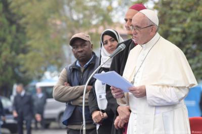 Francis visited a drab refugee center on the outskirts of Bologna known simply as “The Hub”. Run by a charity, it is home to about 1,000 asylum seekers, most of whom risked their lives crossing the Mediterranean from Africa and the Middle East.