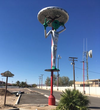 A giant alien robot holding a ray gun is a sign of the Fresh Alien Jerky. Here, green aliens with lightbulb-shaped heads sit on the roof of this Area 51 themed store. More look down from saucer-topped lights in the parking lot or sit by the entrance in the silver alien space car or the shiny flying saucers.